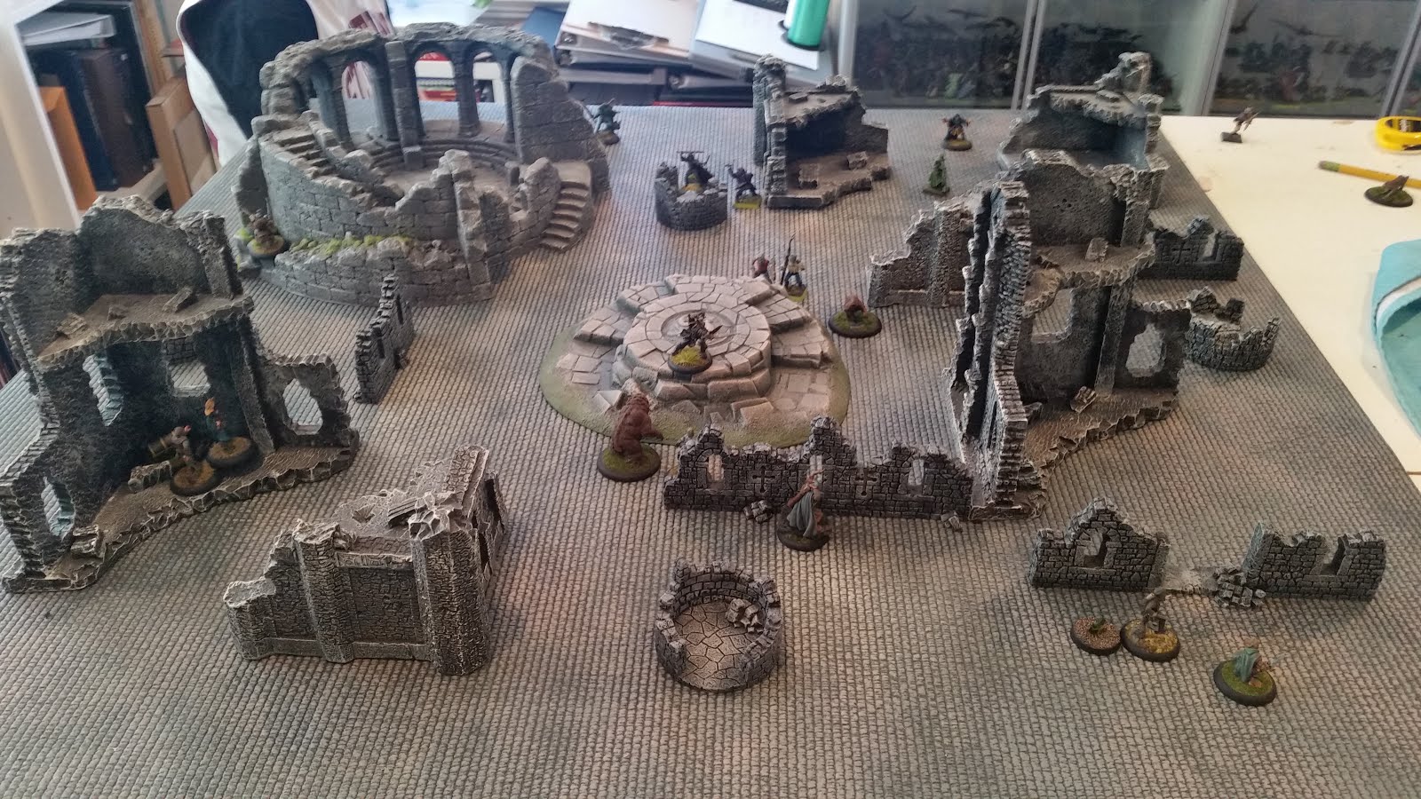In this game the warbands come upon the scene of a Golem attack, and corpses are everywhere! We used the red tokens to represent bodies of adventurers who had been slain by the Golem. These can be looted in the scenario. There is a chance they can contain treasure - but there is also a chance they will spring up as a Zombie! The Golem himself is not encountered in this scenario.